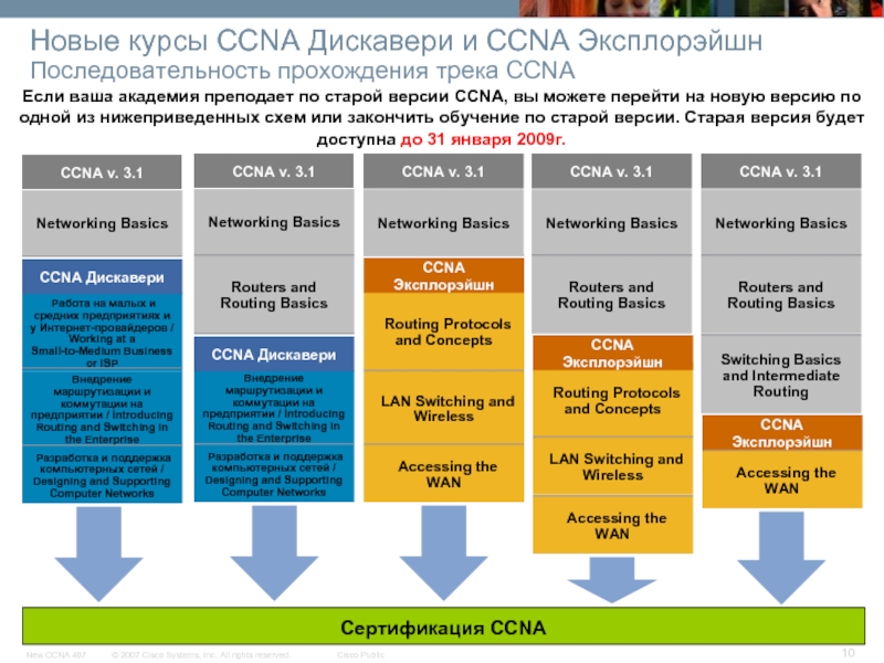 Если ваша академия преподает по старой версии CCNA, вы можете перейти на новую версию по одной из нижеприведенных схем или закончить обучение по старой версии. Старая версия будет доступна до 31 января 2009г.