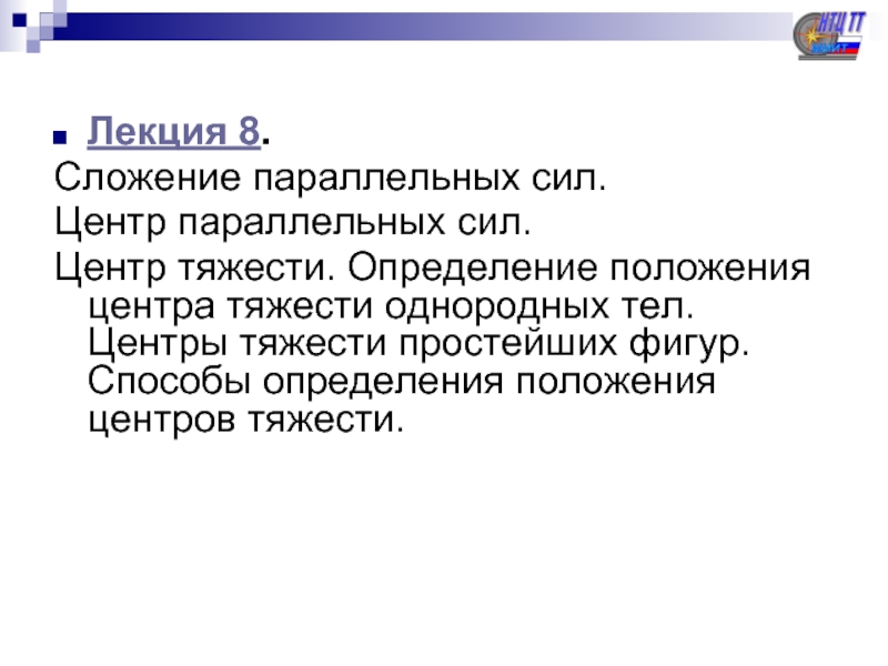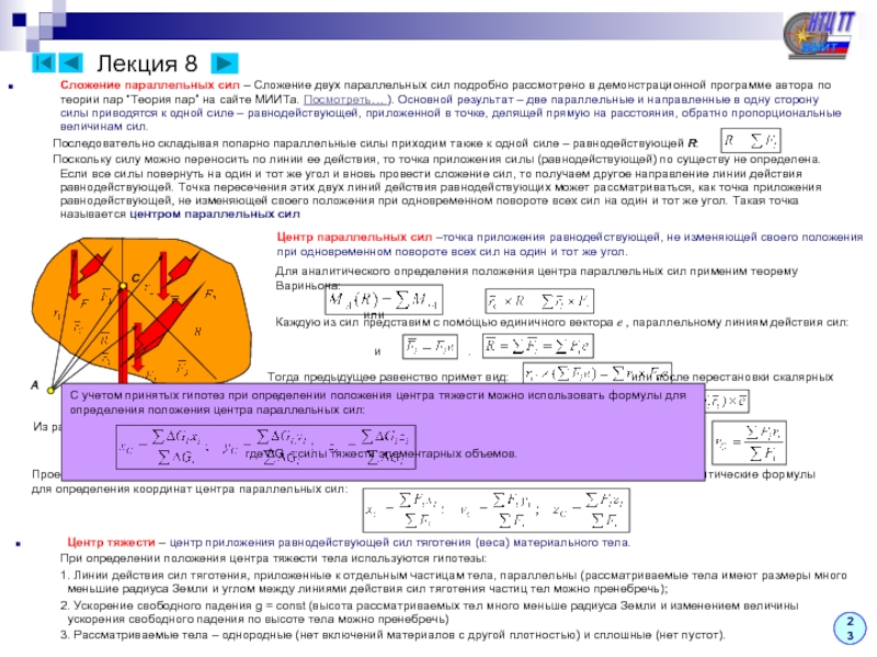 Центр параллельных сил –точка приложения равнодействующей, не изменяющей своего положения