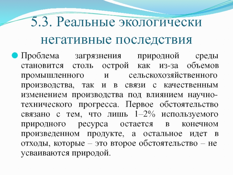 как из-за объемов промышленного и сельскохозяйственного производства, так и в связи с качественным изменением производства под влиянием научно-технического прогресса. Первое обстоятельство связано с тем, что лишь 1–2% используемого природного ресурса остается в конечном произведенном продукте, а остальное идет в отходы, которые – это второе обстоятельство – не усваиваются природой.