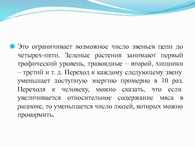 первый трофический уровень, травоядные – второй, хищники – третий и т. д. Переход к каждому следующему звену уменьшает доступную энергию примерно в 10 раз. Переходя к человеку, можно сказать, что если увеличивается относительное содержание мяса в рационе, то уменьшается число людей, которых можно прокормить.
