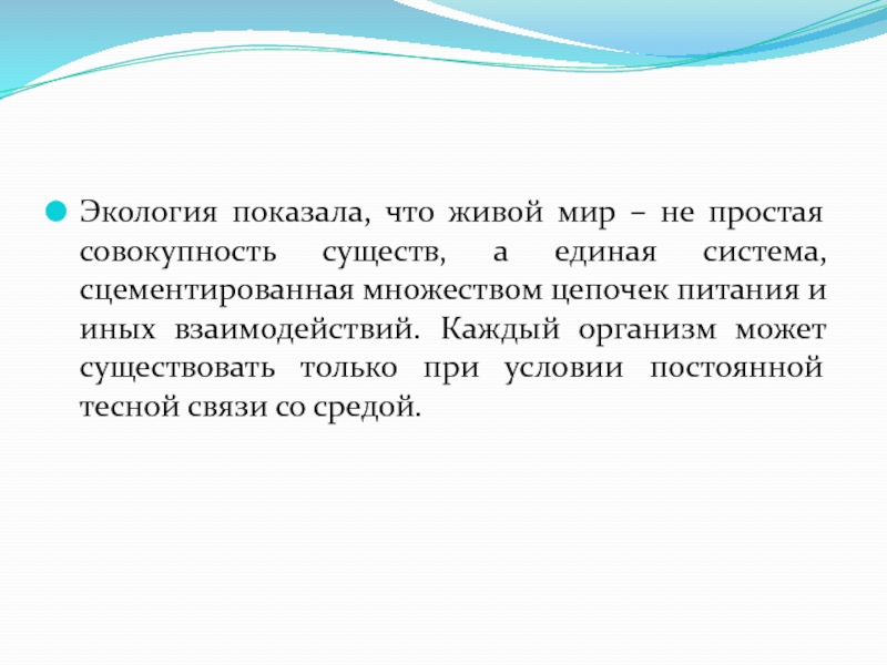единая система, сцементированная множеством цепочек питания и иных взаимодействий. Каждый организм может существовать только при условии постоянной тесной связи со средой.