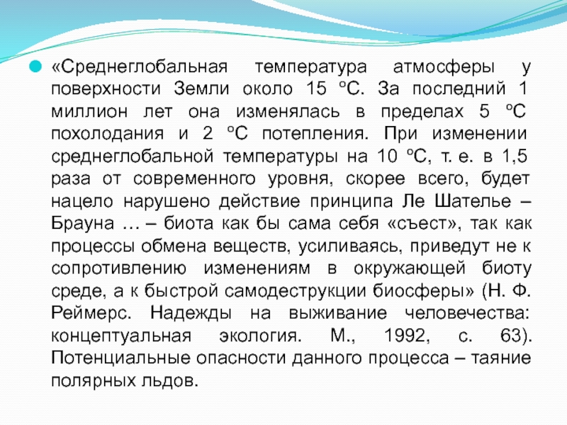 1 миллион лет она изменялась в пределах 5 оС похолодания и 2 оС потепления. При изменении среднеглобальной температуры на 10 оС, т. е. в 1,5 раза от современного уровня, скорее всего, будет нацело нарушено действие принципа Ле Шателье – Брауна … – биота как бы сама себя «съест», так как процессы обмена веществ, усиливаясь, приведут не к сопротивлению изменениям в окружающей биоту среде, а к быстрой самодеструкции биосферы» (Н. Ф. Реймерс. Надежды на выживание человечества: концептуальная экология. М., 1992, с. 63). Потенциальные опасности данного процесса – таяние полярных льдов.