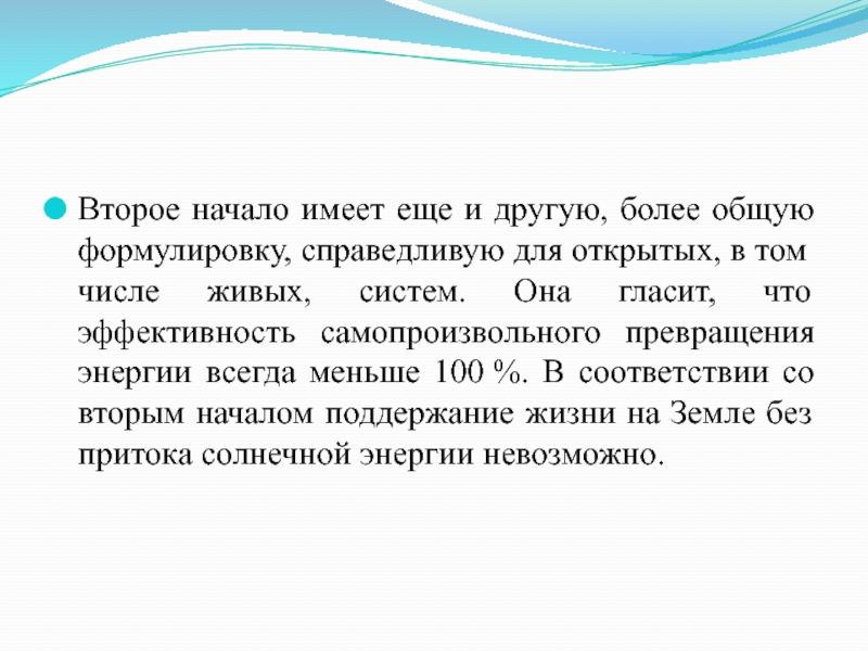 открытых, в том числе живых, систем. Она гласит, что эффективность самопроизвольного превращения энергии всегда меньше 100 %. В соответствии со вторым началом поддержание жизни на Земле без притока солнечной энергии невозможно.