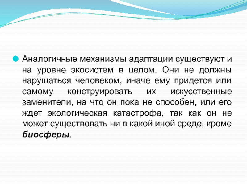 не должны нарушаться человеком, иначе ему придется или самому конструировать их искусственные заменители, на что он пока не способен, или его ждет экологическая катастрофа, так как он не может существовать ни в какой иной среде, кроме биосферы.