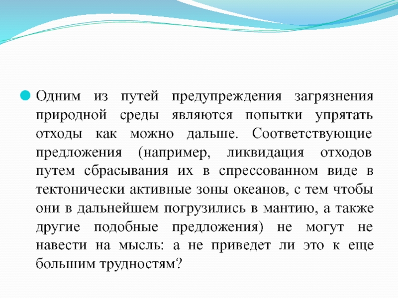 как можно дальше. Соответствующие предложения (например, ликвидация отходов путем сбрасывания их в спрессованном виде в тектонически активные зоны океанов, с тем чтобы они в дальнейшем погрузились в мантию, а также другие подобные предложения) не могут не навести на мысль: а не приведет ли это к еще большим трудностям?