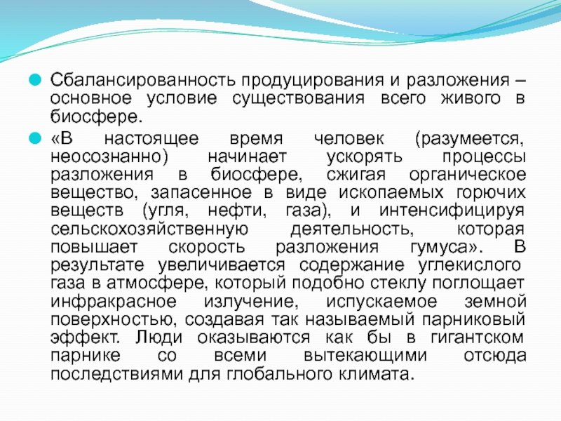 «В настоящее время человек (разумеется, неосознанно) начинает ускорять процессы разложения в биосфере, сжигая органическое вещество, запасенное в виде ископаемых горючих веществ (угля, нефти, газа), и интенсифицируя сельскохозяйственную деятельность, которая повышает скорость разложения гумуса». В результате увеличивается содержание углекислого газа в атмосфере, который подобно стеклу поглощает инфракрасное излучение, испускаемое земной поверхностью, создавая так называемый парниковый эффект. Люди оказываются как бы в гигантском парнике со всеми вытекающими отсюда последствиями для глобального климата.
