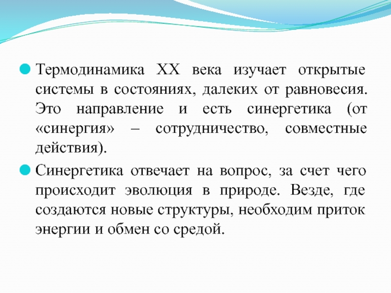 Слайд 66Термодинамика ХХ века изучает открытые системы в состояниях, далеких от равновесия.