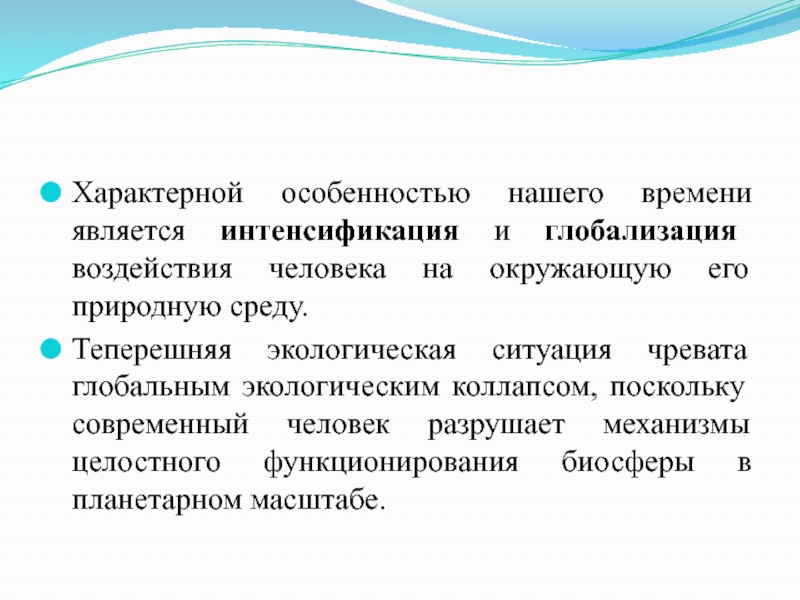 Характерной особенностью нашего времени является интенсификация и глобализация воздействия человека на