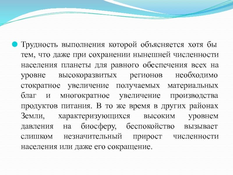 нынешней численности населения планеты для равного обеспечения всех на уровне высокоразвитых регионов необходимо стократное увеличение получаемых материальных благ и многократное увеличение производства продуктов питания. В то же время в других районах Земли, характеризующихся высоким уровнем давления на биосферу, беспокойство вызывает слишком незначительный прирост численности населения или даже его сокращение.