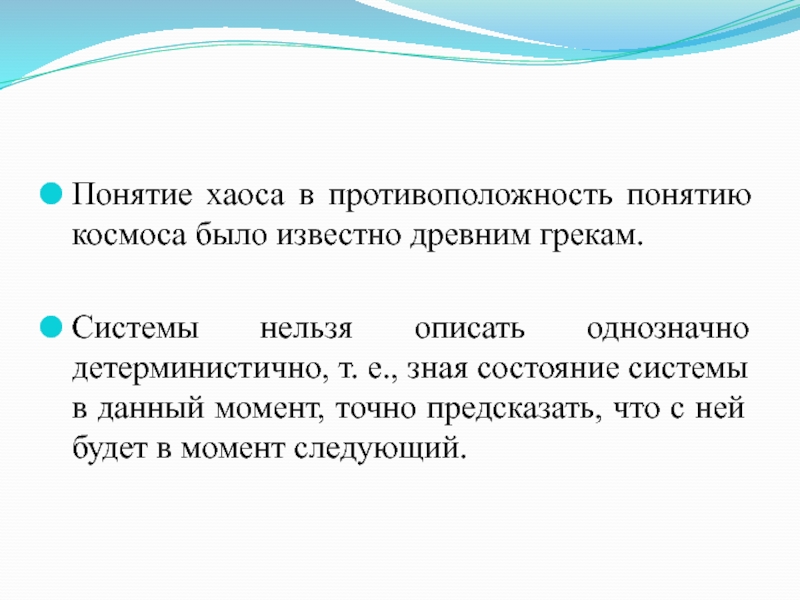 нельзя описать однозначно детерминистично, т. е., зная состояние системы в данный момент, точно предсказать, что с ней будет в момент следующий.