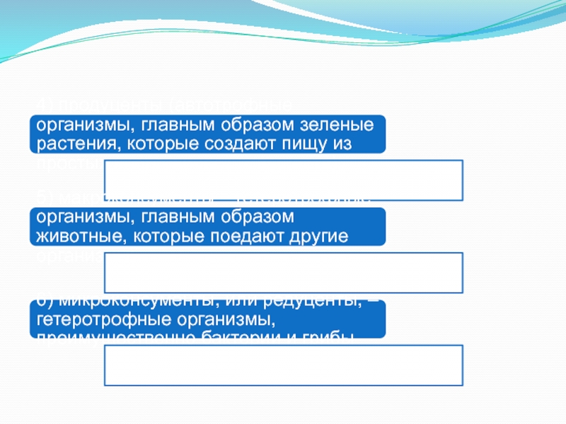 5) макроконсументы – гетеротрофные организмы, главным образом животные, которые поедают другие организмы;