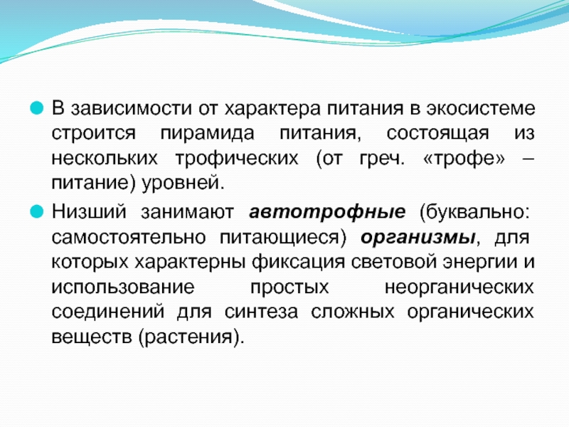 Слайд 10В зависимости от характера питания в экосистеме строится пирамида питания, состоящая