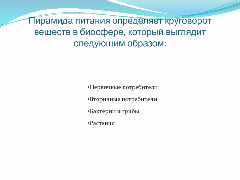 Слайд 14Пирамида питания определяет круговорот веществ в биосфере, который выглядит следующим образом: