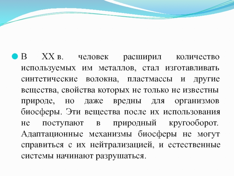 волокна, пластмассы и другие вещества, свойства которых не только не известны природе, но даже вредны для организмов биосферы. Эти вещества после их использования не поступают в природный кругооборот. Адаптационные механизмы биосферы не могут справиться с их нейтрализацией, и естественные системы начинают разрушаться.