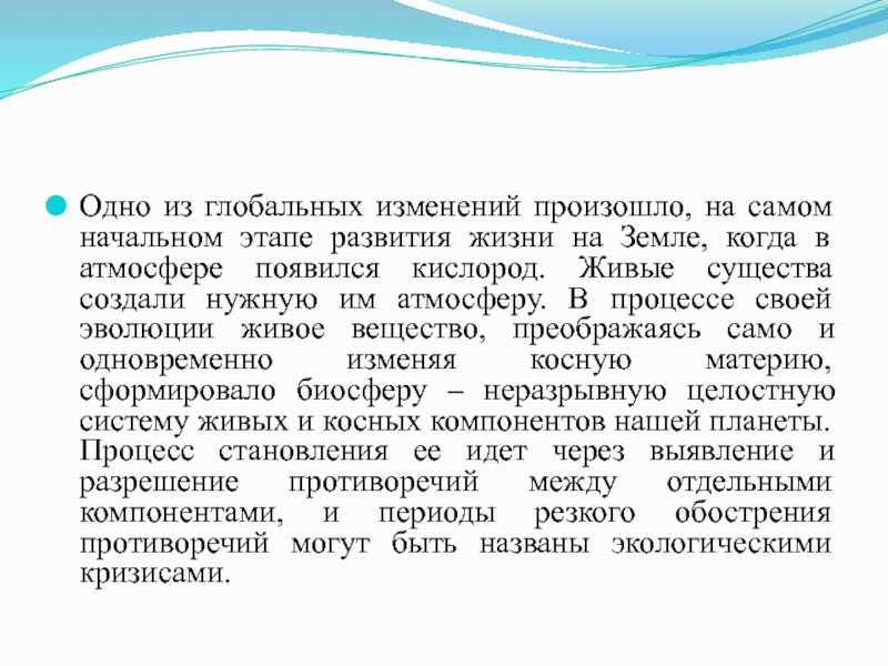 на Земле, когда в атмосфере появился кислород. Живые существа создали нужную им атмосферу. В процессе своей эволюции живое вещество, преображаясь само и одновременно изменяя косную материю, сформировало биосферу – неразрывную целостную систему живых и косных компонентов нашей планеты. Процесс становления ее идет через выявление и разрешение противоречий между отдельными компонентами, и периоды резкого обострения противоречий могут быть названы экологическими кризисами.