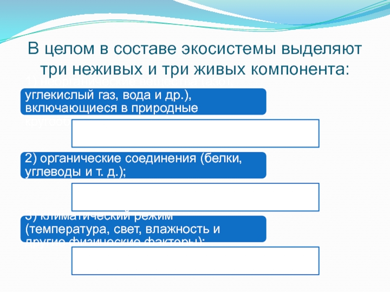 Слайд 12В целом в составе экосистемы выделяют три неживых и три живых