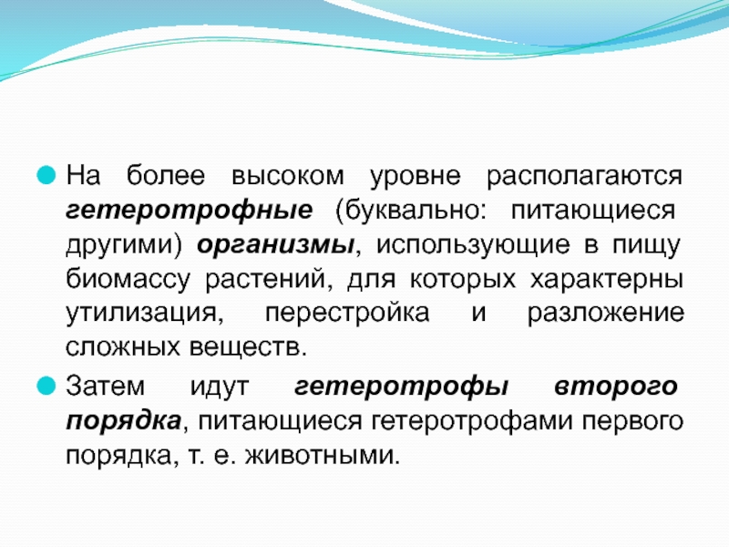 На более высоком уровне располагаются гетеротрофные (буквально: питающиеся другими) организмы, использующие