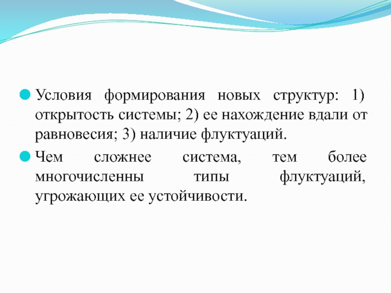 Условия формирования новых структур: 1) открытость системы; 2) ее нахождение вдали