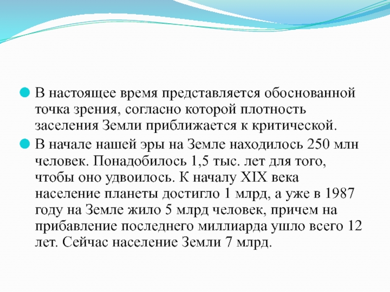 В начале нашей эры на Земле находилось 250 млн человек. Понадобилось 1,5 тыс. лет для того, чтобы оно удвоилось. К началу XIX века население планеты достигло 1 млрд, а уже в 1987 году на Земле жило 5 млрд человек, причем на прибавление последнего миллиарда ушло всего 12 лет. Сейчас население Земли 7 млрд.