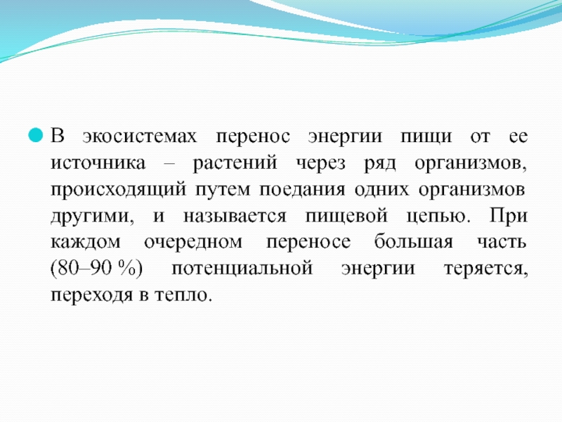 ряд организмов, происходящий путем поедания одних организмов другими, и называется пищевой цепью. При каждом очередном переносе большая часть (80–90 %) потенциальной энергии теряется, переходя в тепло.