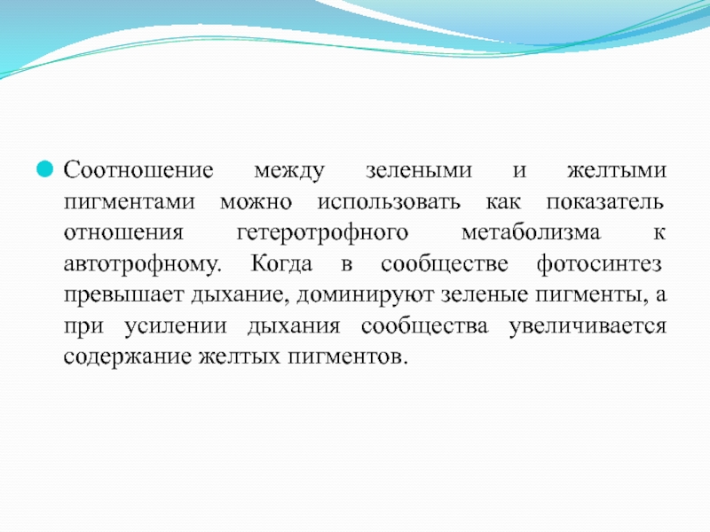 гетеротрофного метаболизма к автотрофному. Когда в сообществе фотосинтез превышает дыхание, доминируют зеленые пигменты, а при усилении дыхания сообщества увеличивается содержание желтых пигментов.