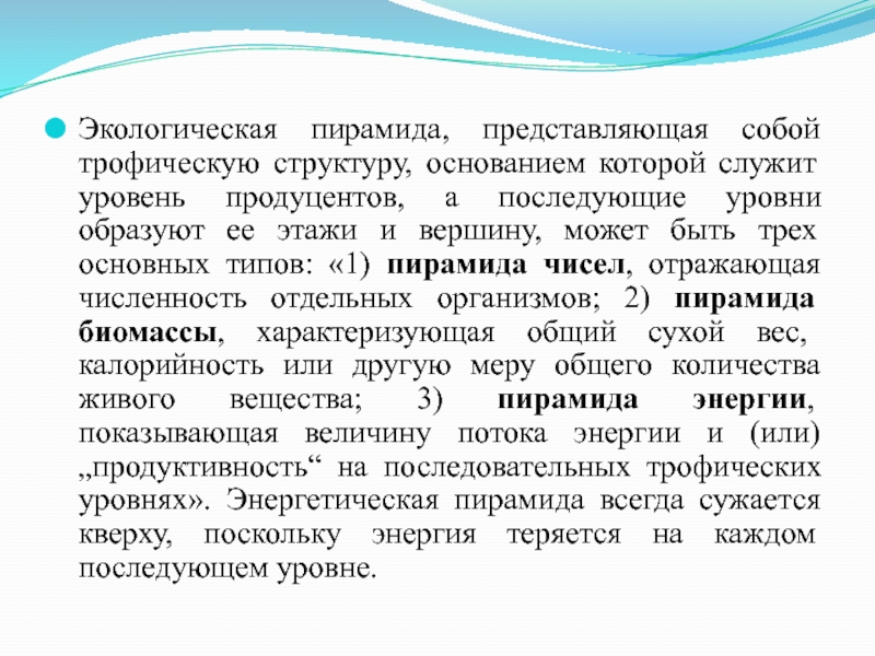 а последующие уровни образуют ее этажи и вершину, может быть трех основных типов: «1) пирамида чисел, отражающая численность отдельных организмов; 2) пирамида биомассы, характеризующая общий сухой вес, калорийность или другую меру общего количества живого вещества; 3) пирамида энергии, показывающая величину потока энергии и (или) „продуктивность“ на последовательных трофических уровнях». Энергетическая пирамида всегда сужается кверху, поскольку энергия теряется на каждом последующем уровне.