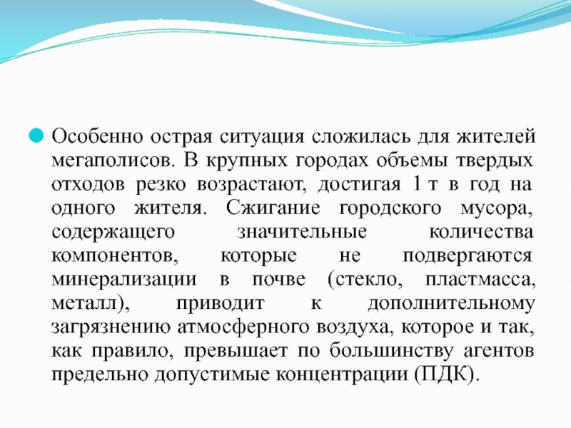 твердых отходов резко возрастают, достигая 1 т в год на одного жителя. Сжигание городского мусора, содержащего значительные количества компонентов, которые не подвергаются минерализации в почве (стекло, пластмасса, металл), приводит к дополнительному загрязнению атмосферного воздуха, которое и так, как правило, превышает по большинству агентов предельно допустимые концентрации (ПДК).