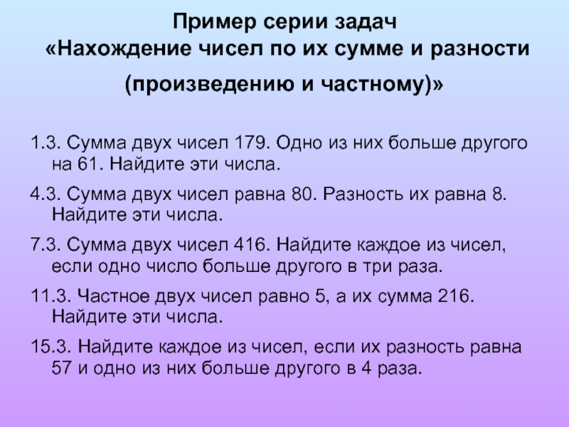 1.3. Сумма двух чисел 179. Одно из них больше другого на 61. Найдите эти числа.