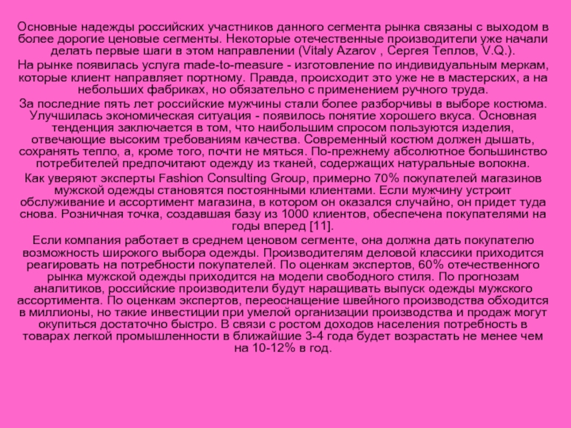 Если компания работает в среднем ценовом сегменте, она должна дать покупателю возможность широкого выбора одежды. Производителям деловой классики приходится реагировать на потребности покупателей. По оценкам экспертов, 60% отечественного рынка мужской одежды приходится на модели свободного стиля. По прогнозам аналитиков, российские производители будут наращивать выпуск одежды мужского ассортимента. По оценкам экспертов, переоснащение швейного производства обходится в миллионы, но такие инвестиции при умелой организации производства и продаж могут окупиться достаточно быстро. В связи с ростом доходов населения потребность в товарах легкой промышленности в ближайшие 3-4 года будет возрастать не менее чем на 10-12% в год.