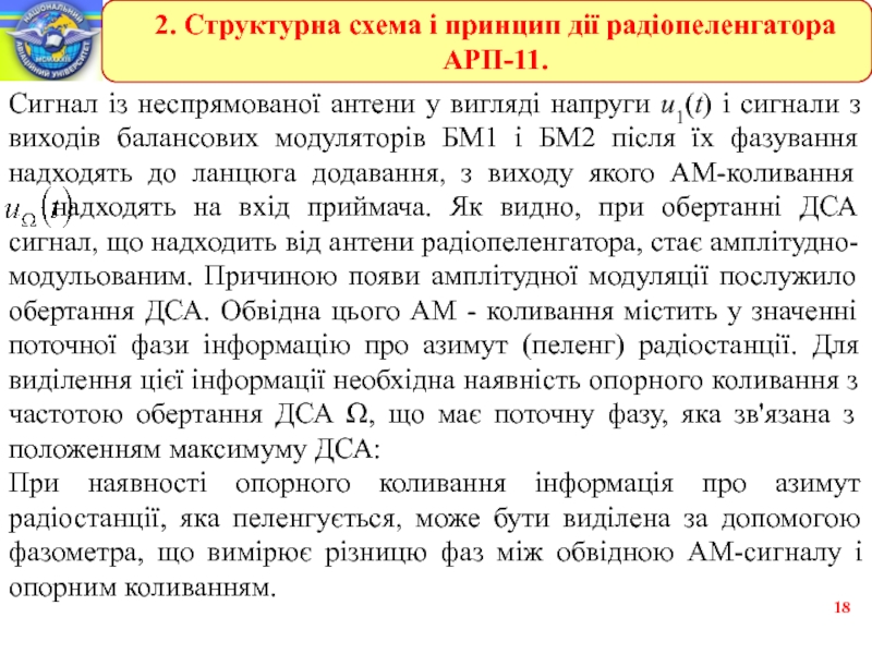 u1(t) і сигнали з виходів балансових модуляторів БМ1 і БМ2 після їх фазування надходять до ланцюга додавання, з виходу якого АМ-коливання надходять на вхід приймача. Як видно, при обертанні ДСА сигнал, що надходить від антени радіопеленгатора, стає амплітудно-модульованим. Причиною появи амплітудної модуляції послужило обертання ДСА. Обвідна цього АМ - коливання містить у значенні поточної фази інформацію про азимут (пеленг) радіостанції. Для виділення цієї інформації необхідна наявність опорного коливання з частотою обертання ДСА Ω, що має поточну фазу, яка зв'язана з положенням максимуму ДСА: