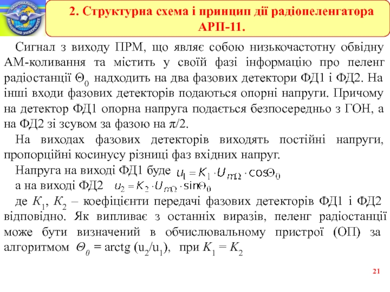 де К1, К2 – коефіцієнти передачі фазових детекторів ФД1 і ФД2 відповідно. Як випливає з останніх виразів, пеленг радіостанції може бути визначений в обчислювальному пристрої (ОП) за алгоритмом Θ0 = arctg (u2/u1), при K1 = K2