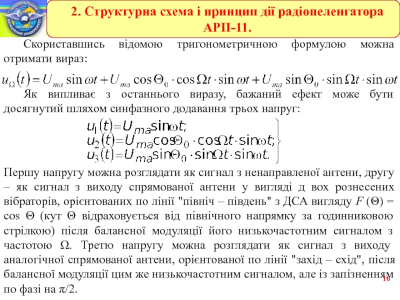 Першу напругу можна розглядати як сигнал з ненаправленої антени, другу – як сигнал з виходу спрямованої антени у вигляді д вох рознесених вібраторів, орієнтованих по лінії "північ – південь" з ДСА вигляду F (Θ) = cos Θ (кут Θ відраховується від північного напрямку за годинниковою стрілкою) після балансної модуляції його низькочастотним сигналом з частотою Ω. Третю напругу можна розглядати як сигнал з виходу аналогічної спрямованої антени, орієнтованої по лінії "захід – схід", після балансної модуляції цим же низькочастотним сигналом, але із запізненням по фазі на π/2.