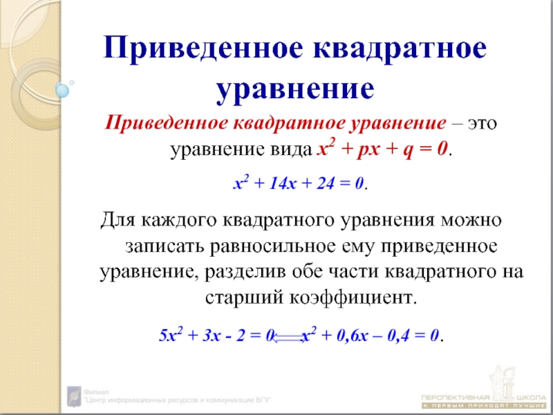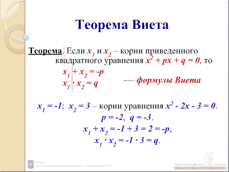 то х1 и х2 – корни приведенного квадратного уравнения х2 + px + q = 0.
