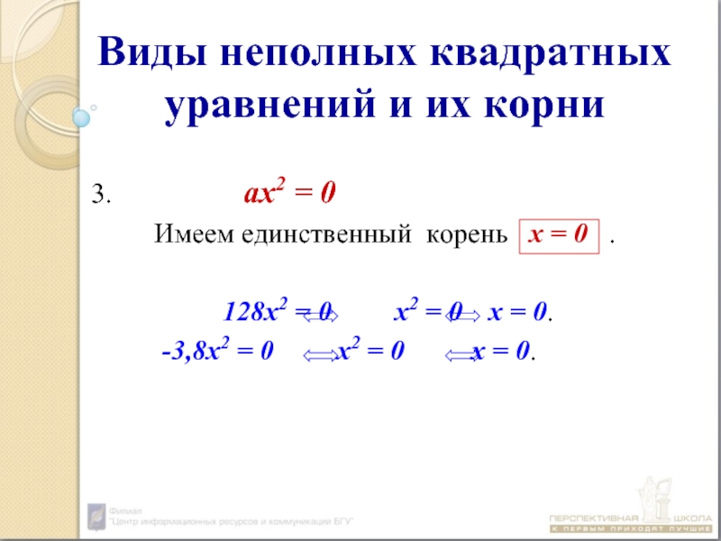 Слайд 6Виды неполных квадратных уравнений и их корни
