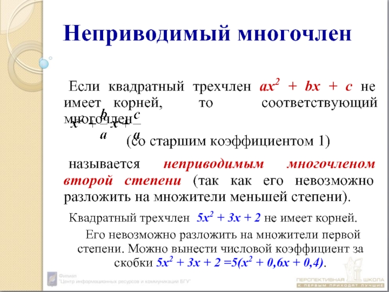 называется неприводимым многочленом второй степени (так как его невозможно разложить на множители меньшей степени).