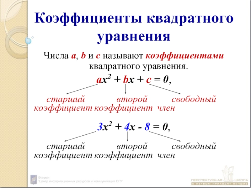 Числа а, b и с называют коэффициентами квадратного уравнения.