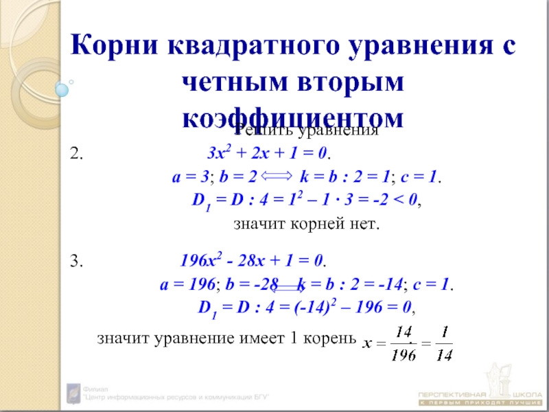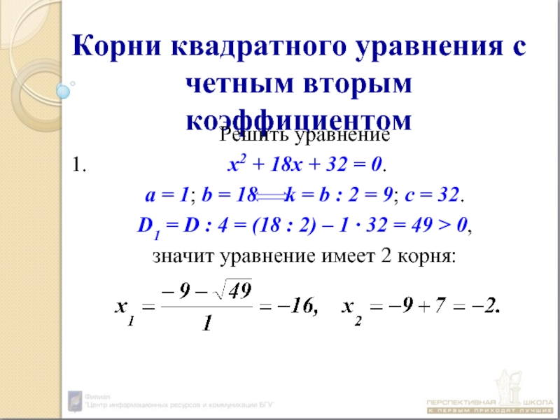 Слайд 13Корни квадратного уравнения с четным вторым коэффициентом