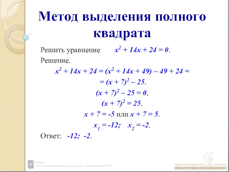 х2 + 14x + 24 = (х2 + 14x + 49) – 49 + 24 =