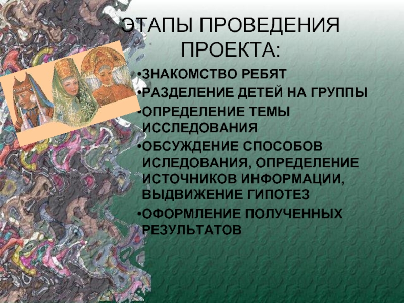 Русские костюмы были очень красочными. Шили их из тканей различных оттенков красного (багряные, червленые), сине-голубого (лазоревые), иногда зеленого цвета. Все цветные ткани назывались крашенинами, В народе чаще всего шили одежды из льняных тканей с набивным узором и из пестряди — ткани из ниток разного цвета.