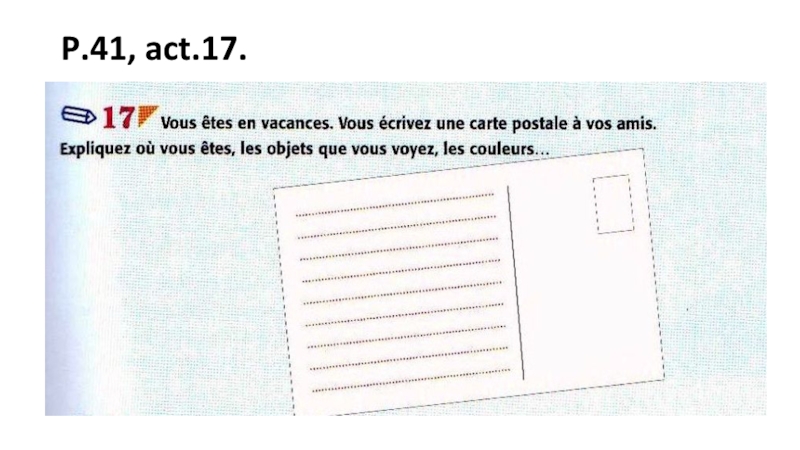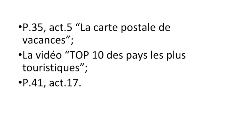 Слайд 3P.35, act.5 “La carte postale de vacances”;