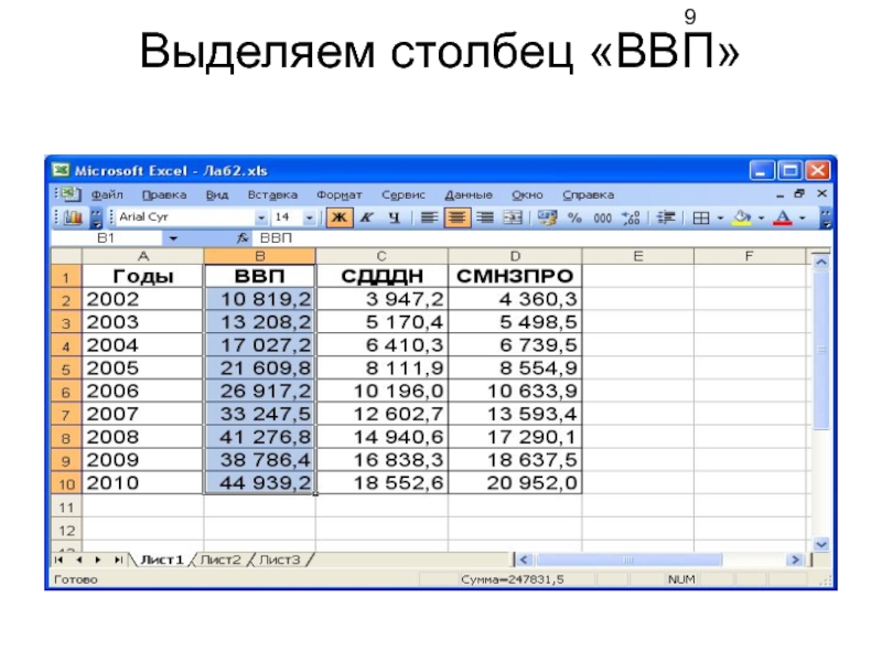 Выделяем столбец «ВВП» (см. слайд 9)