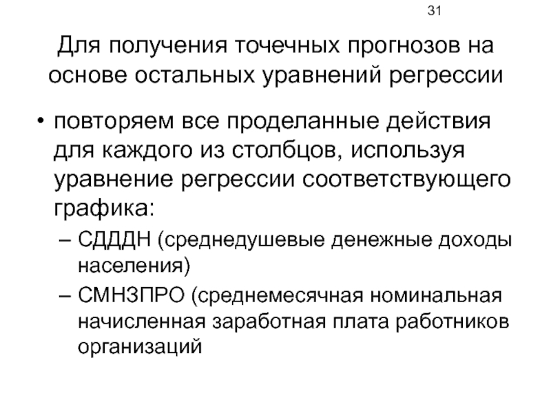 Слайд 31Для получения точечных прогнозов на основе остальных уравнений регрессии