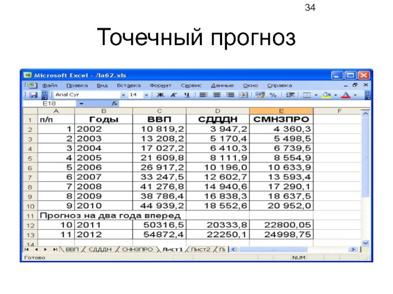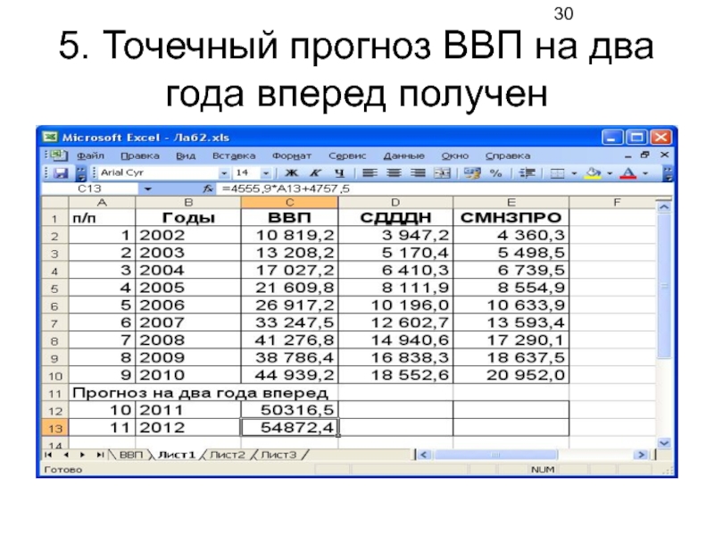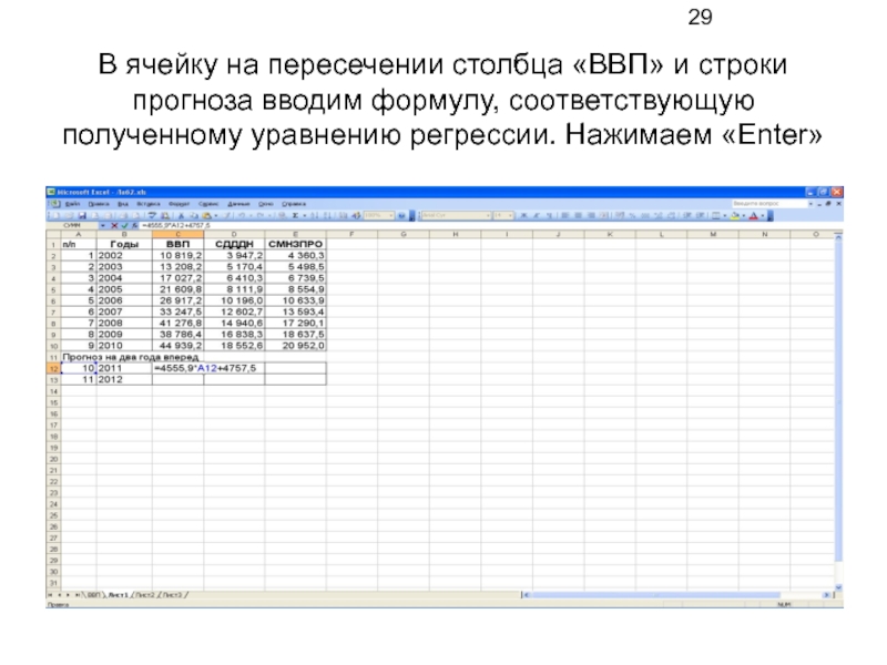 Слайд 29В ячейку на пересечении столбца «ВВП» и строки прогноза вводим формулу,