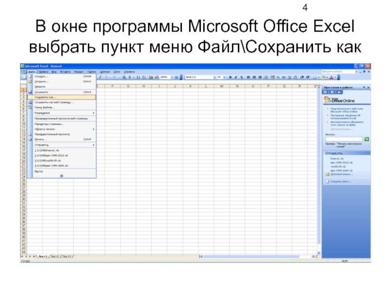 Слайд 4В окне программы Microsoft Office Excel выбрать пункт меню Файл\Сохранить как