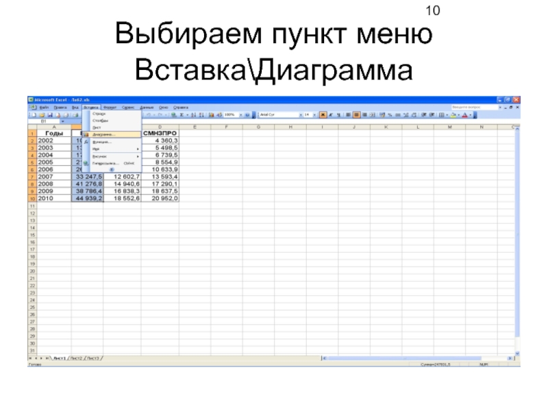 Слайд 10Выбираем пункт меню Вставка\Диаграмма