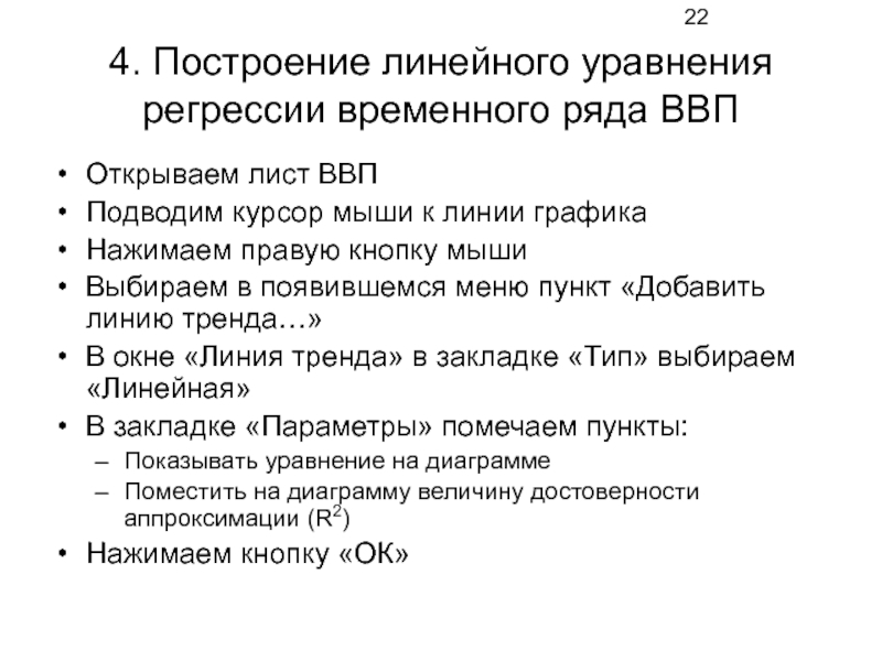 Слайд 224. Построение линейного уравнения регрессии временного ряда ВВП