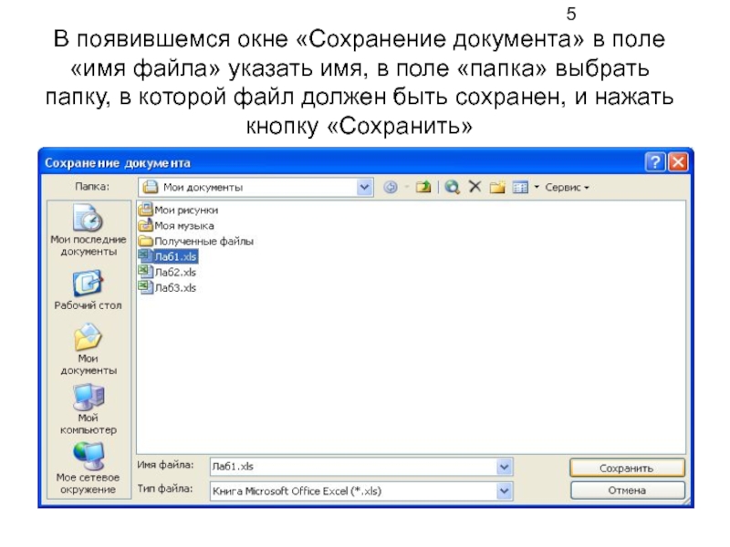 Слайд 5В появившемся окне «Сохранение документа» в поле «имя файла» указать имя,