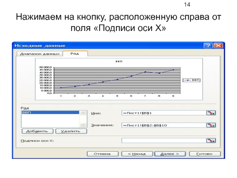 Слайд 14Нажимаем на кнопку, расположенную справа от поля «Подписи оси Х»