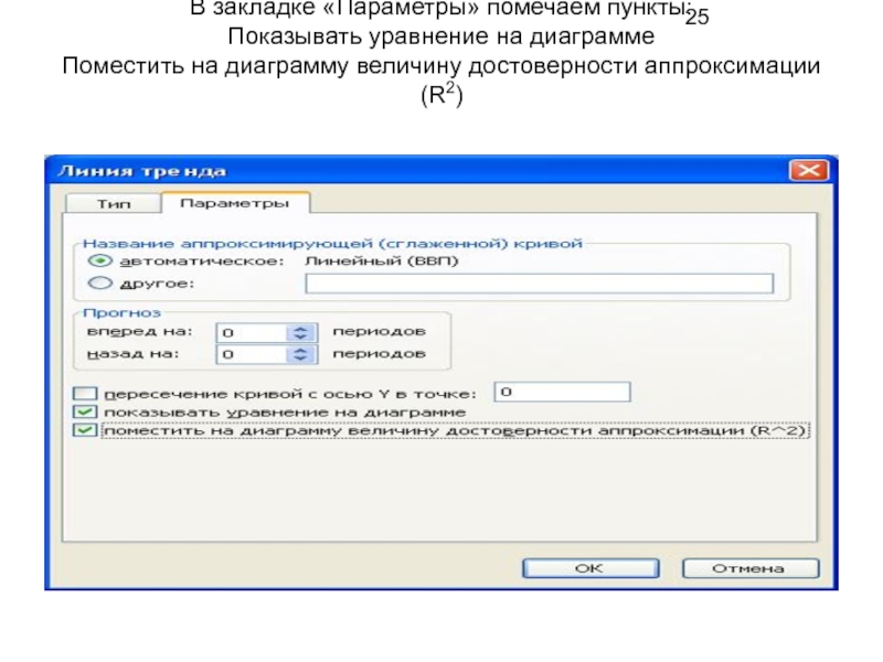Слайд 24В окне «Линия тренда» в закладке «Тип» выбираем «Линейная»