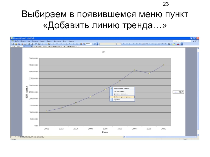 Слайд 23Выбираем в появившемся меню пункт «Добавить линию тренда…»